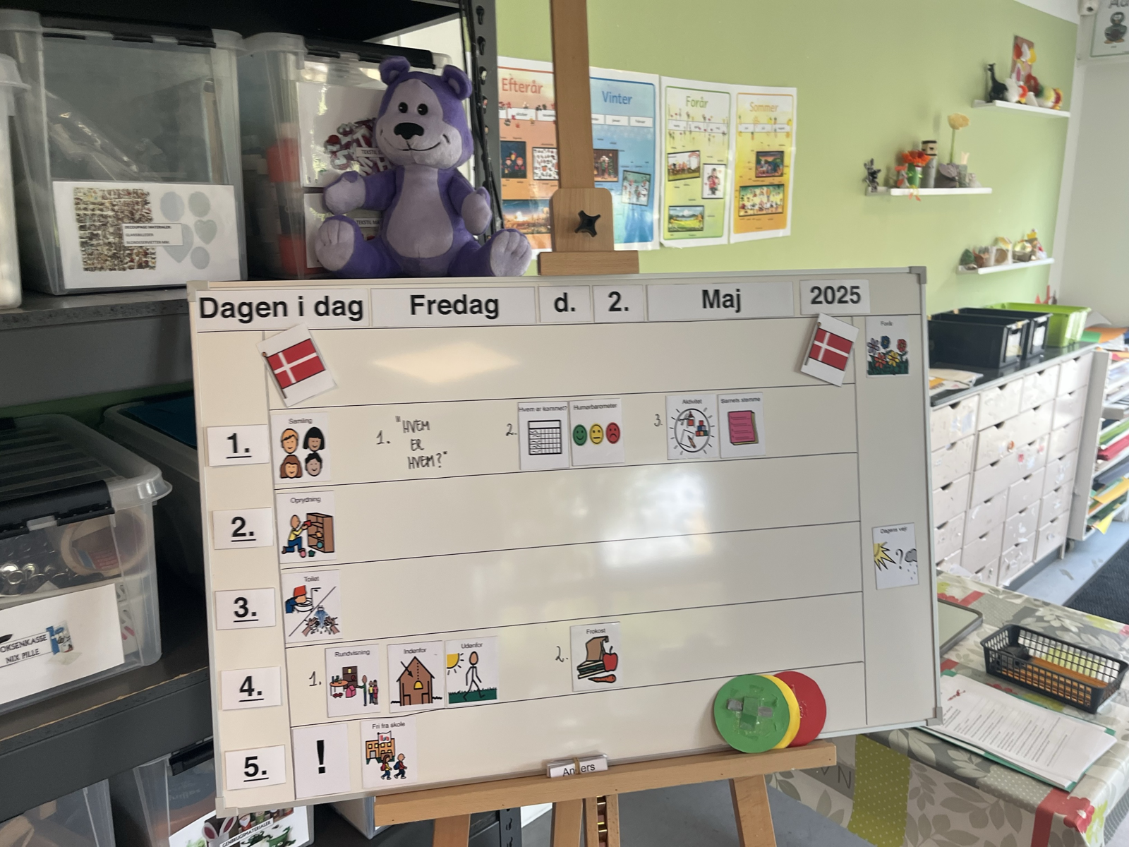 Vi tilrettelægger hverdagen, så den er genkendelig og overskuelig. Med afsæt i børnenes erfaringer fra børnehaven arbejder vi blandt andet med samlinger og visuelle støttesystemer, der hjælper børnene med at orientere sig i dagens aktiviteter og fællesskaber.